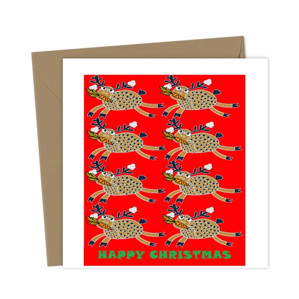 Rows of stylised Reindeer with carrot in mouth & snow on their antlers race across this colourful playful Christmas card design, set on a vibrant festive red background.