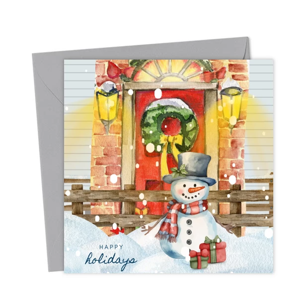 A cheerful snowman stands before a cozy cottage’s red door, lit by warm lanterns. Snow piles high and gently falls around the scene. A perfect winter greeting. Caption: “Happy Holidays.”