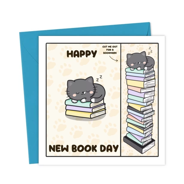 Happy New Book Birthday Card: Integrated Bookmark – Greetings Card
