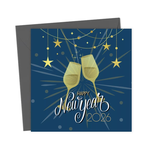 A festive blue card featuring two champagne glasses clinking in celebration, with bright fireworks in the background. A perfect way to welcome the season. Caption: “Happy New Year 2026.
