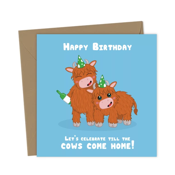 Celebrate their birthday with this funny Highland cow birthday card. Featuring cute cows in hats and a wine bottle, it’s perfect for friends, family, animal lovers and fun farm themed celebrations.