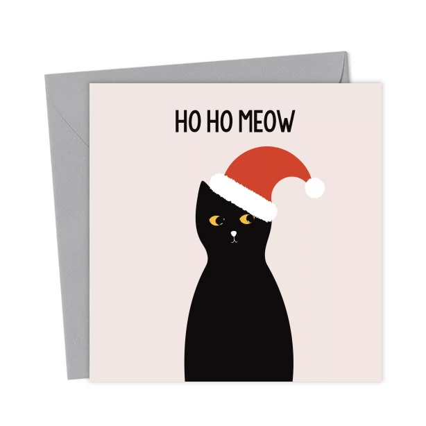 Ho Ho Meow Mischievous Christmas Cat in a Santa Hat – Greetings Card