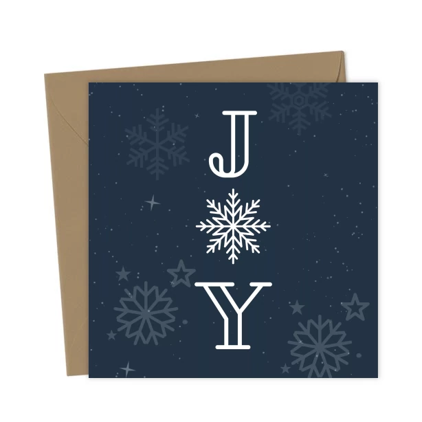 A dark blue Christmas card with the word “JOY” written vertically, the “O” replaced by a delicate snowflake. Light, transparent snowflakes gently fall across the card for a festive, elegant look.