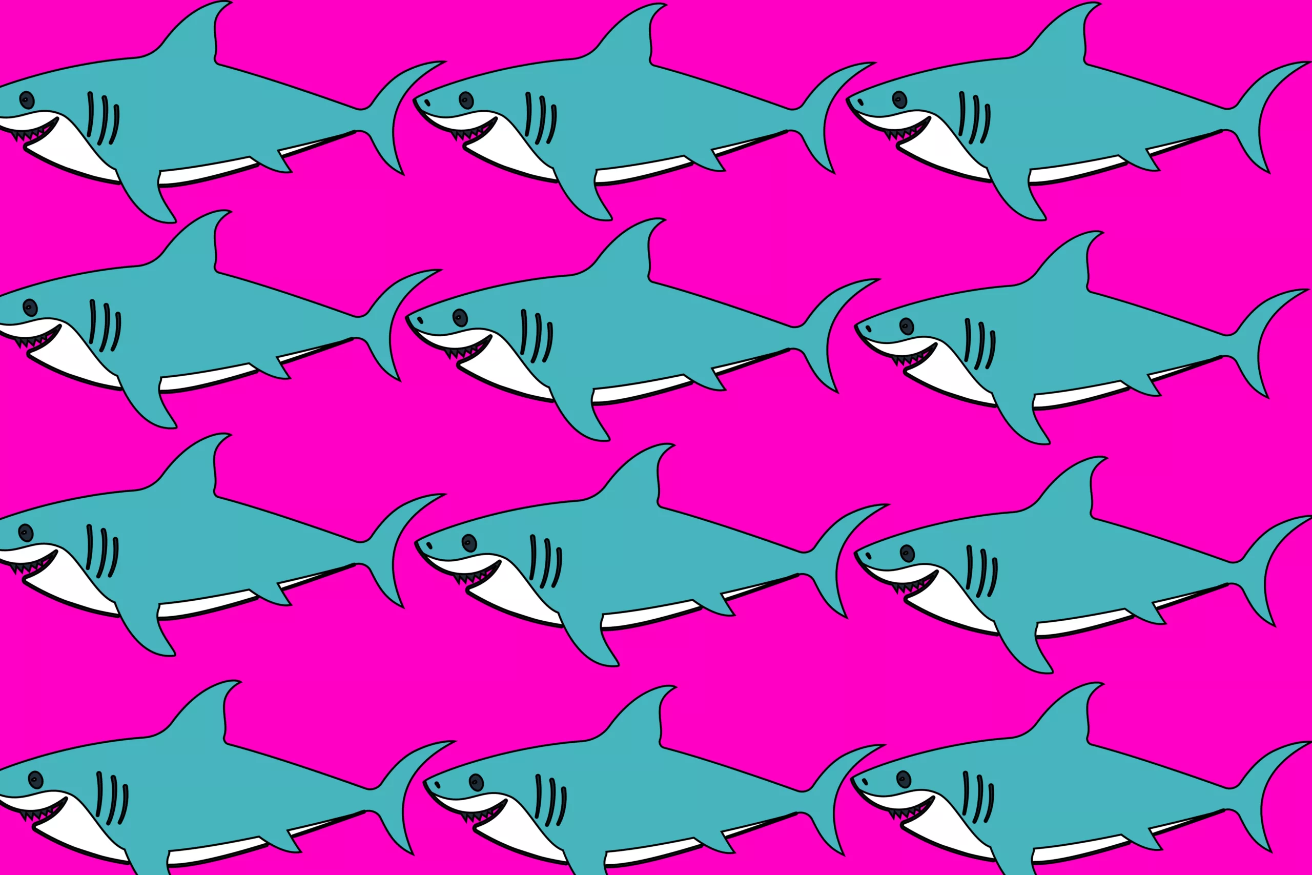 A vibrant, bold and bright design depicting rows of happy sharks on colourful pink background