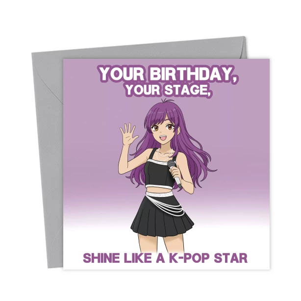 Celebrate their birthday with this K-pop inspired card. Featuring a cute pop star singer design, it’s perfect for music fans, teens and anyone who loves to shine on their special day.