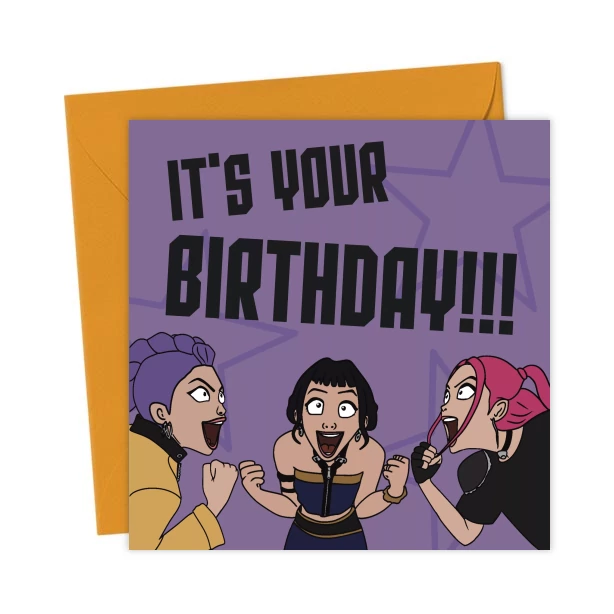 Make any Kpop Demon Hunter fans day by getting this fab birthday card featuring Rumi, Mira and Zoey – everyone’s fave characters from the hit Netflix movie.