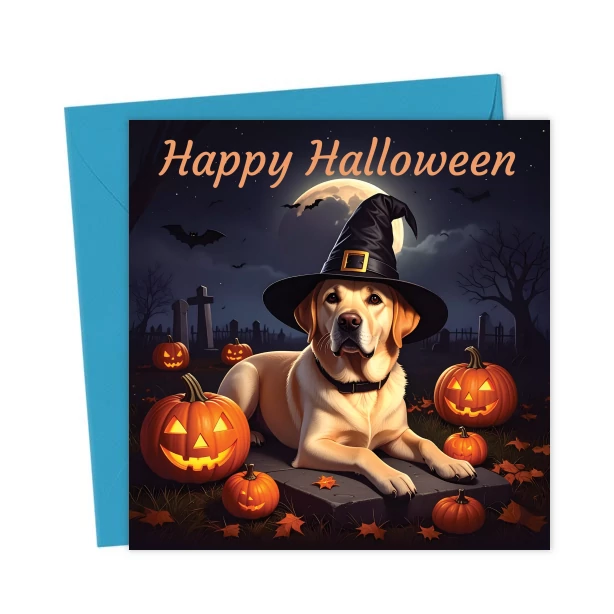 Send halloween greetings with this Labrador Halloween Card. Featuring a yellow Labrador wearing witch’s hat among halloween pumpkins in a graveyard, this halloween card is perfect for dog lovers.