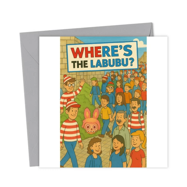 Cute happy birthday pop mart Labubu greetings card. Perfect to send your friends on their special day. Inspired by the popular where’s wally.