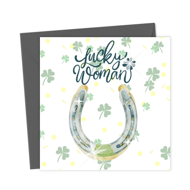 A beautiful card featuring a horseshoe surrounded by sparkling stars, with the uplifting caption: “Lucky Woman.” Perfect for celebrating good fortune and positivity.