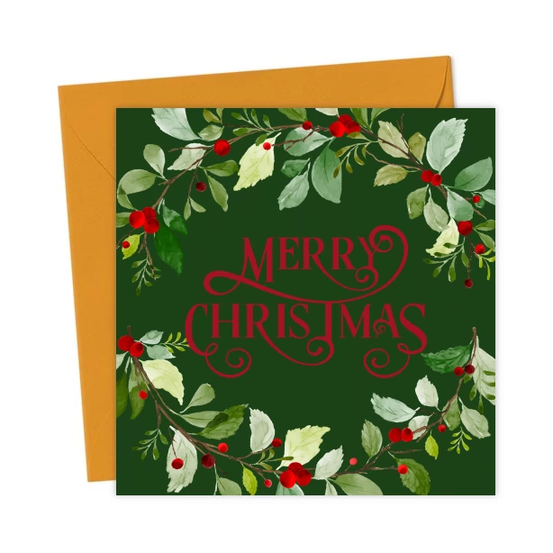 Celebrate in timeless style, featuring a classic holly and berry wreath design on a rich green background, this luxury Christmas card captures the warmth and elegance of traditional holiday card