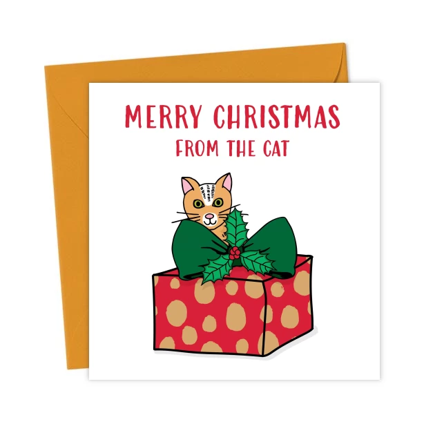 Send this funny illustrated Christmas card of a cat and present to your cat loving family members or friends to wish them a Merry Christmas From The Cat. It’s sure to be the purrfect card for them!