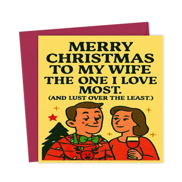 Merry Christmas – Funny Husband-to-Wife Card. For the woman he loves most… and lusts over the least. This hilariously honest card blends vintage charm with festive sarcasm. Perfect for long-term love,