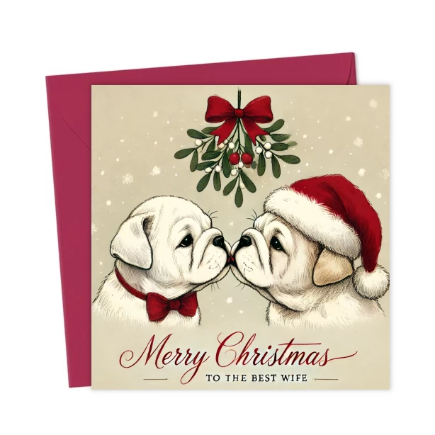 Send this beautiful British bulldogs kissing under the mistletoe Christmas card to your dog loving wife this Christmas! Super cute and romantic to show her how much you love her.