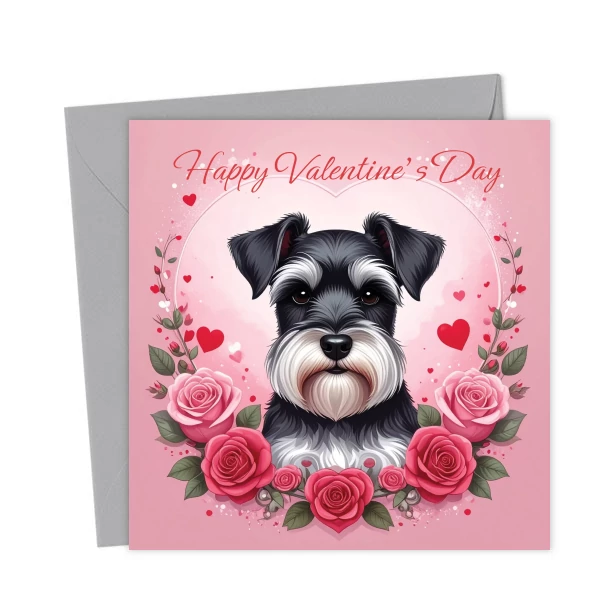 Schnauzer Valentine’s Day card featuring a salt & pepper Schnauzer framed by pink roses and hearts, with “Happy Valentine’s Day” in elegant script. Ideal Valentine’s card for any Schnauzer lover.