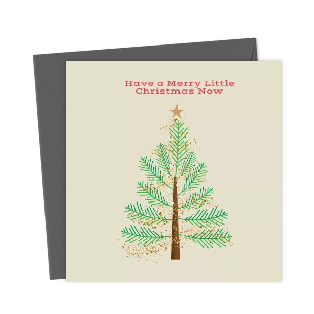 A soft beige card featuring a charming, Charlie Brown–style Christmas tree adorned with a single star and delicate gold tinsel. A sweet, simple design with the caption: “Have a Merry Little Christmas