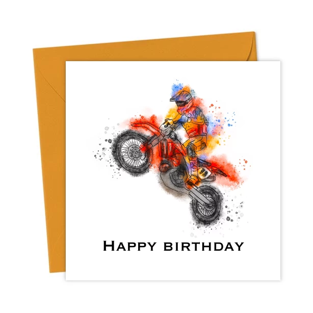 A watercolour motocross birthday card. Great for anyone into motocross or motorbikes, A fun, colourful design.