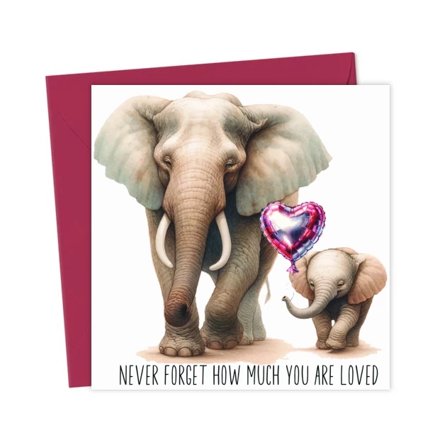 A sweet illustration of a parent and baby elephant walking together, with a heart balloon floating beside them — a gentle reminder that you are always deeply loved.