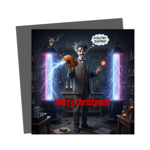 Nikolai Tesla cooks the Christmas turkey – Greetings Card