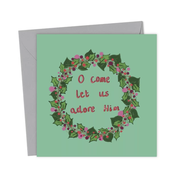 Festive green Christmas wreath design with the words ‘O come let us adore Him’, from the well loved Christmas carol.