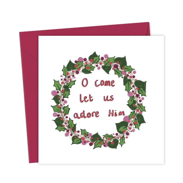 Festive white Christmas wreath design with the words ‘O come let us adore Him’, from the well loved Christmas carol.