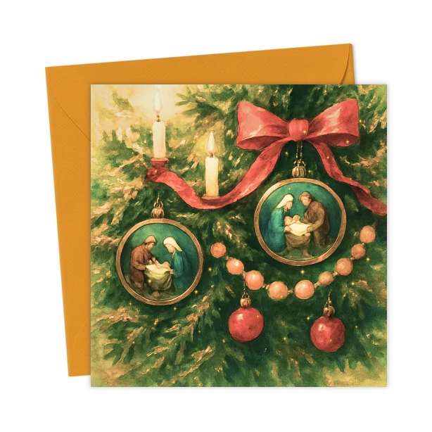 “Oh Christmas Tree” card celebrates the season with this traditional tree illustration alongside beautifully rendered Nativity scenes—perfect for sending warm, meaningful festive wishes