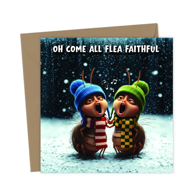 Spread some festive cheer with this funny “Oh Come All Flea Faithful” Christmas card! Perfect for pun lovers, carol fans, and anyone who enjoys a quirky holiday laugh.