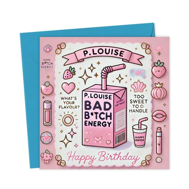 P.Louise pink birthday card with fun “Bad B*tch Energy” vibes. Cute, girly, and full of attitude — perfect for a confident bestie!