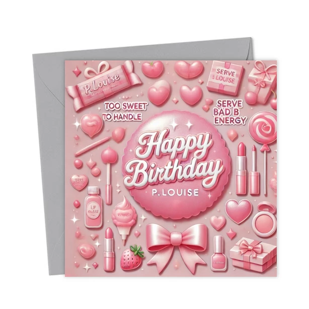Pink, sweet and glam! This P.Louise birthday card is filled with hearts, bows and beauty vibes. Perfect for serving Bad B Energy on their special day.