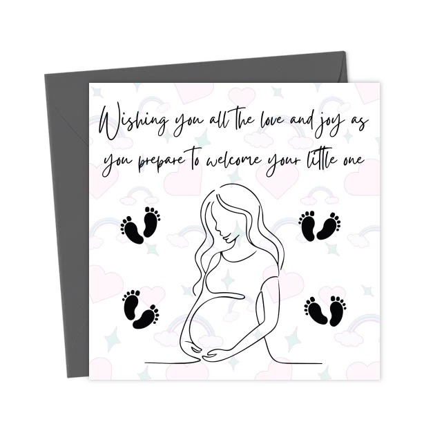 A sweet pregnancy congratulations card: “Wishing you all the love and joy as you prepare to welcome your little one.” Perfect for expecting parents, baby showers, or pregnancy announcements.