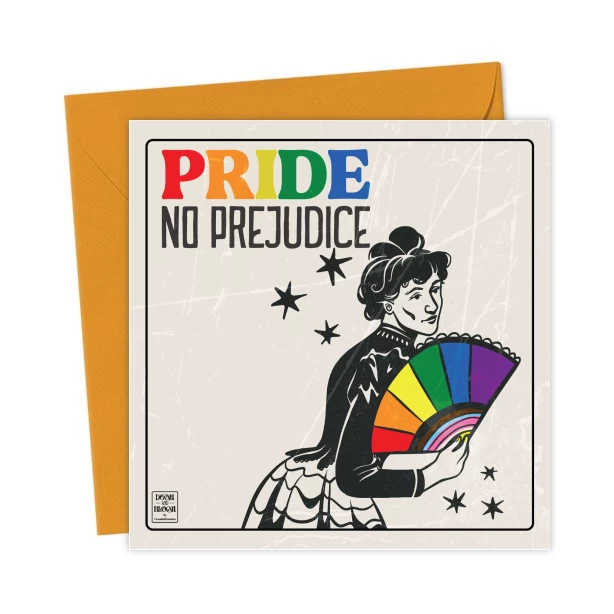 Celebrate love, identity, and unapologetic fabulousness with this bold and witty “Pride No Prejudice” card. Perfect for Pride Month, coming out celebrations and weddings