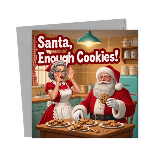 Santa’s Holiday Cookie Overload – Greetings Card