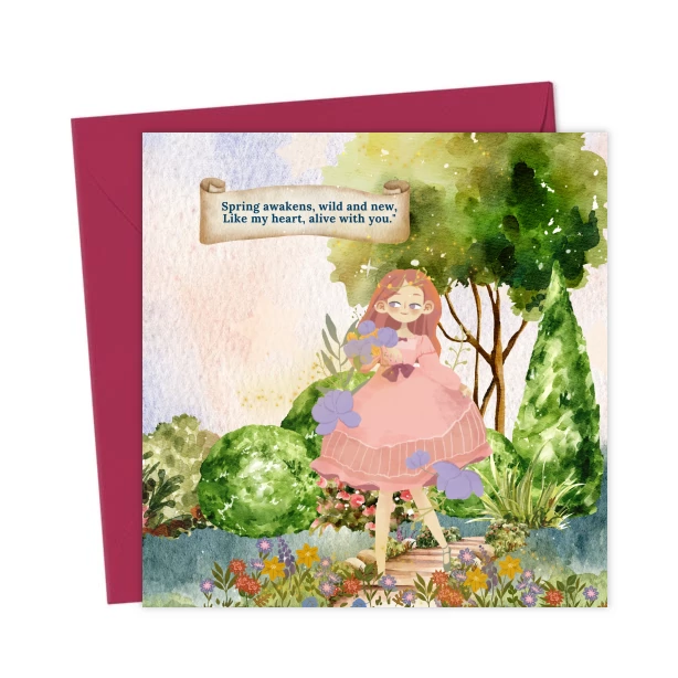 Enchanting card featuring a girl in a pretty pink dress among blooming flowers and trees. Caption: “Spring awakens wild and new, like my heart alive with you.” Perfect for celebrating love and renewal