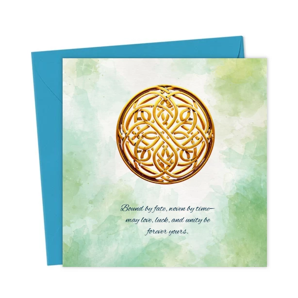 Elegant St. Patrick’s Day card featuring a gold Irish emblem with the heartfelt caption: “Bound by fate, woven by time—may love, luck, and unity be forever yours.”