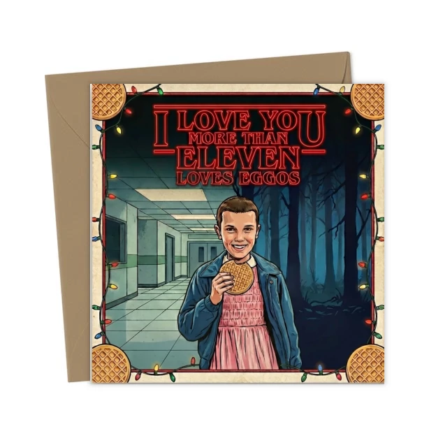 Send love from the Upside Down! This high-quality card features Eleven and the sweet message: “I love you more than Eleven loves Eggos.” Perfect for your favorite sci-fi fan.