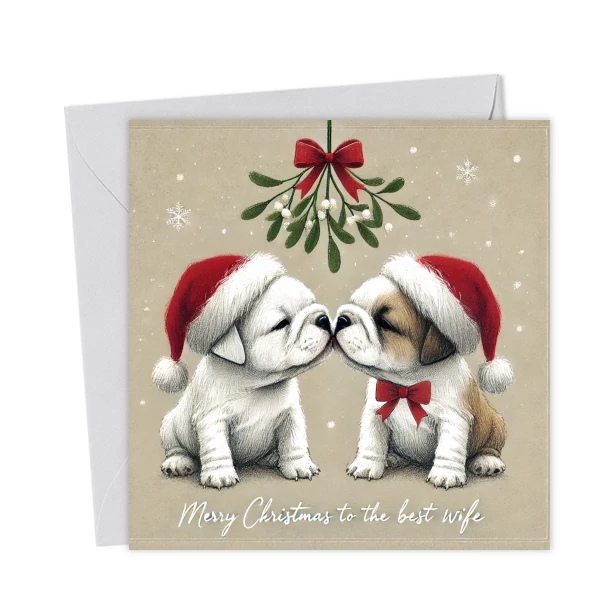 A heartwarming Christmas card featuring two bulldog puppies sharing a sweet kiss under the mistletoe. Perfect for the best wife and ideal for dog lovers who adore cute, romantic holiday puppy designs