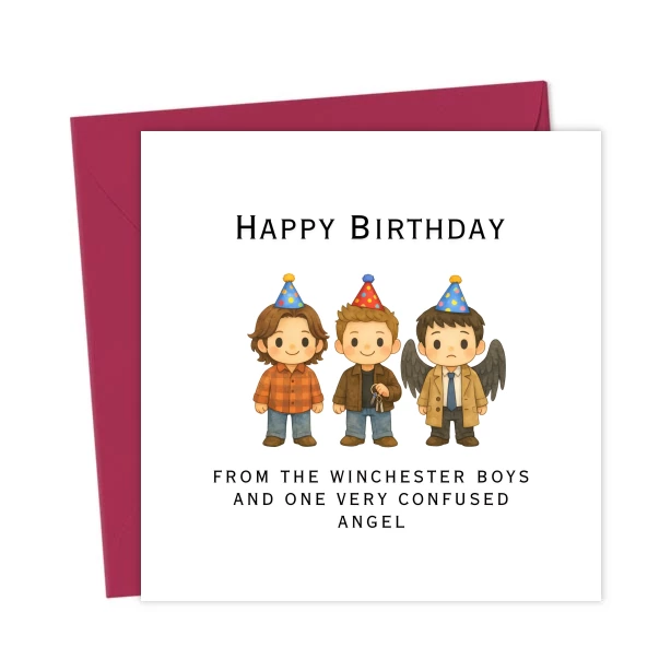 Celebrate their big day Winchester-style with this adorable SPN Birthday card featuring chibi Sam, Dean, and Castiel — complete with party hats and Cas looking adorably confused as always