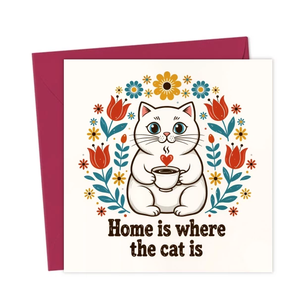 The card depicts a white cat holding a cup of hot beverage with a heart-shaped steam rising from it, surrounded by floral decorations. The text “Home is where the cat is” is written below the cat.