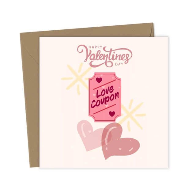 A charming pale pink Valentine’s Day card featuring a love coupon, adorned with two little hearts and stars. Caption: “Happy Valentine’s Day.” Perfect for a sweet, romantic gesture.