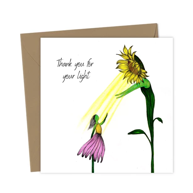 A bright, uplifting card showing a sunflower person shining light onto a smaller flower. Perfect for expressing gratitude to someone who inspires and encourages you. Great for friends and family.