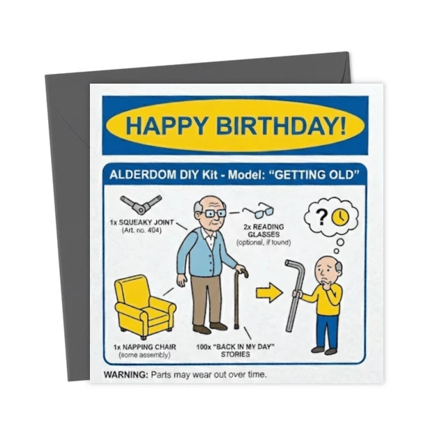 Forget the meatballs, serve up some structural decline with this hilarious flat-pack instruction manual birthday card. Designed for the birthday builder who is starting to feel a bit creaky.