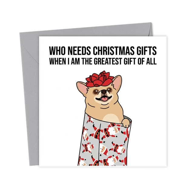Ditch the expensive presents this year—this little guy is all you need! This hilarious Christmas card features a modern, stylised illustration of a smug Chihuahua wrapped up in festive paper.