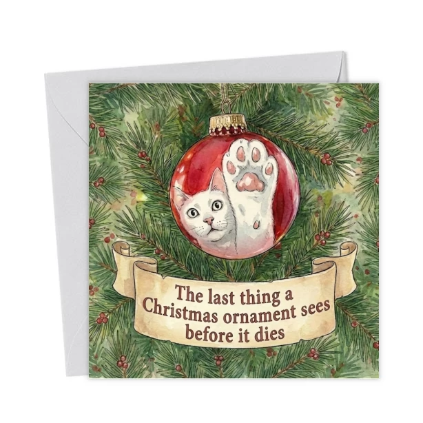 POV: You are shiny, breakable, and about to meet the Murder Mittens. Hilarious but truthful cat Christmas card. Perfect for a card from the cat, or just someone who loves them.