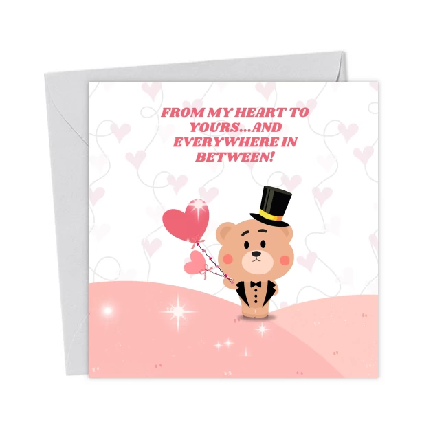 A charming Valentine’s Day card featuring a bear in a top hat holding heart-shaped balloons, with the playful caption: “From my heart to yours… and everywhere in between!” Perfect for loved ones.