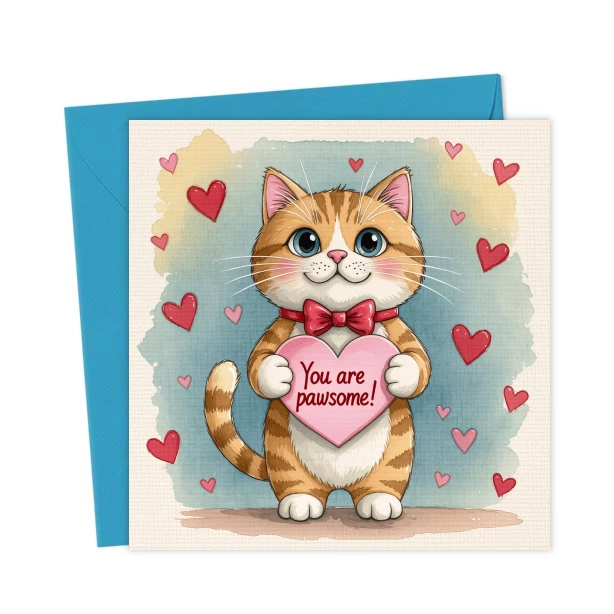 Ginger tabby cat holding a heart-shaped card saying “You are pawsome!” with hearts in the background
