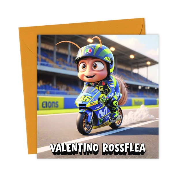 Rev up the laughs with this Valentino Rossflea greeting card. Perfect for MotoGP lovers, motorbike fans, racing obsessives, or anyone who loves a clever pun.