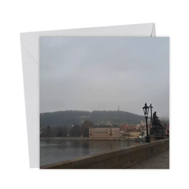 Moody Prague riverside view from Charles Bridge, featuring historic buildings, calm waters, and misty hills. A serene, atmospheric card perfect for travel lovers and special messages.