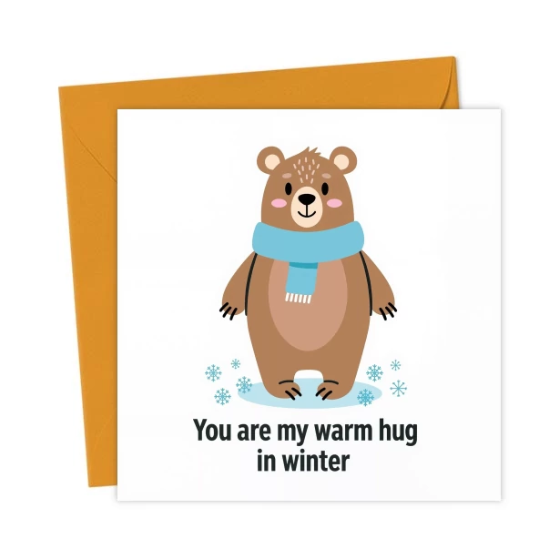 This loving illustration features a friendly brown cartoon bear, wearing a cozy light blue scarf, standing amidst a scattering of blue snowflakes.