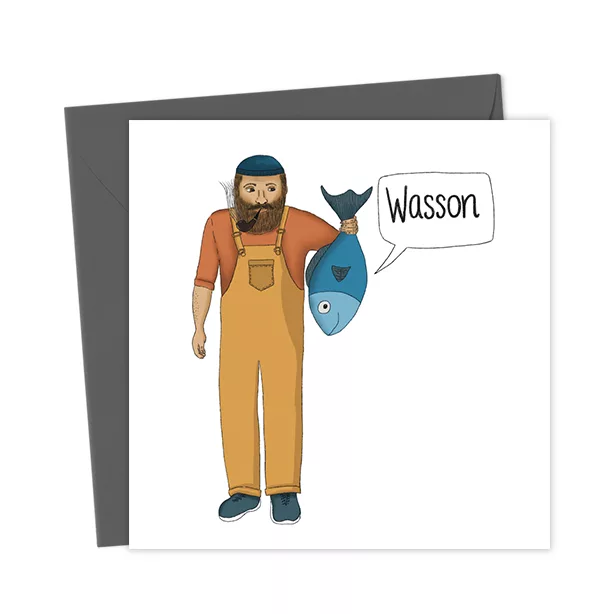 This card stars a fisherman and his catch; a freshly caught fish that says ‘Wasson’. This card is a great way to check in with a friend, or to say hello, thinking of you or even Happy Birthday!