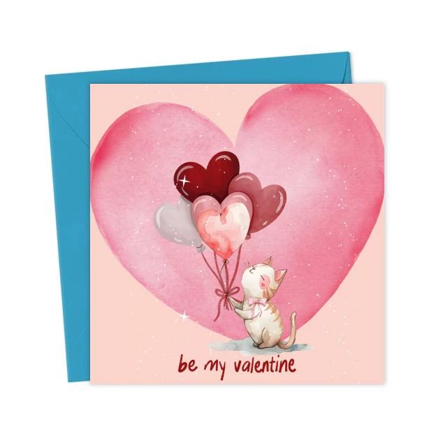 A charming pink Valentine’s Day card featuring a lovely watercolor cat holding heart balloons. Caption: “Be My Valentine.” Perfect for sending sweet, heartfelt love.