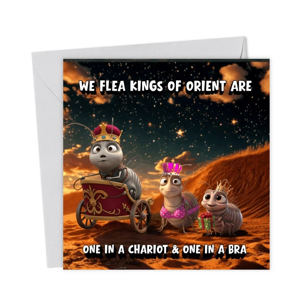 Funny “We Flea Kings of Orient Are” Christmas card featuring cartoon fleas with crowns, a chariot, and a bra. Perfect for pun lovers and anyone who enjoys quirky, cheeky Christmas humour!